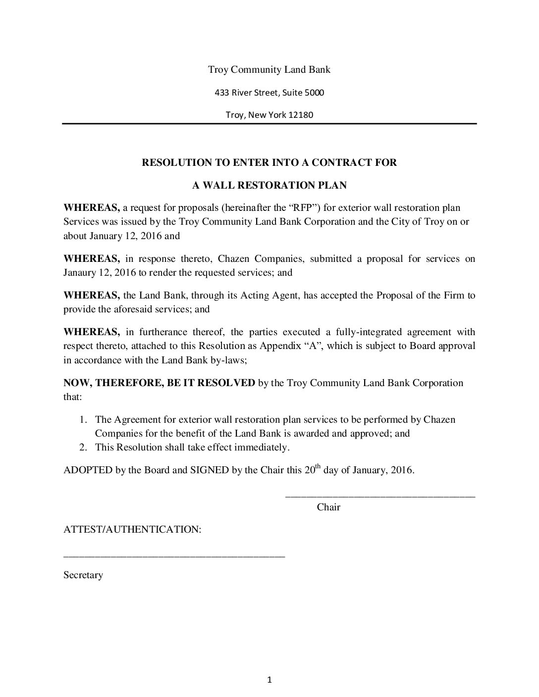 01.20.2016 Resolution to Enter Into Contract For Wall Restoration With Chazen Gallery 01.20.2016 Resolution to Enter Into Contract For Wall Restoration With Chazen 01.20.2016 Resolution to Enter Into Contract For Wall Restoration With Chazen John Ellis2025-07-09T12:11:43-04:00January 20, 2016| Read More