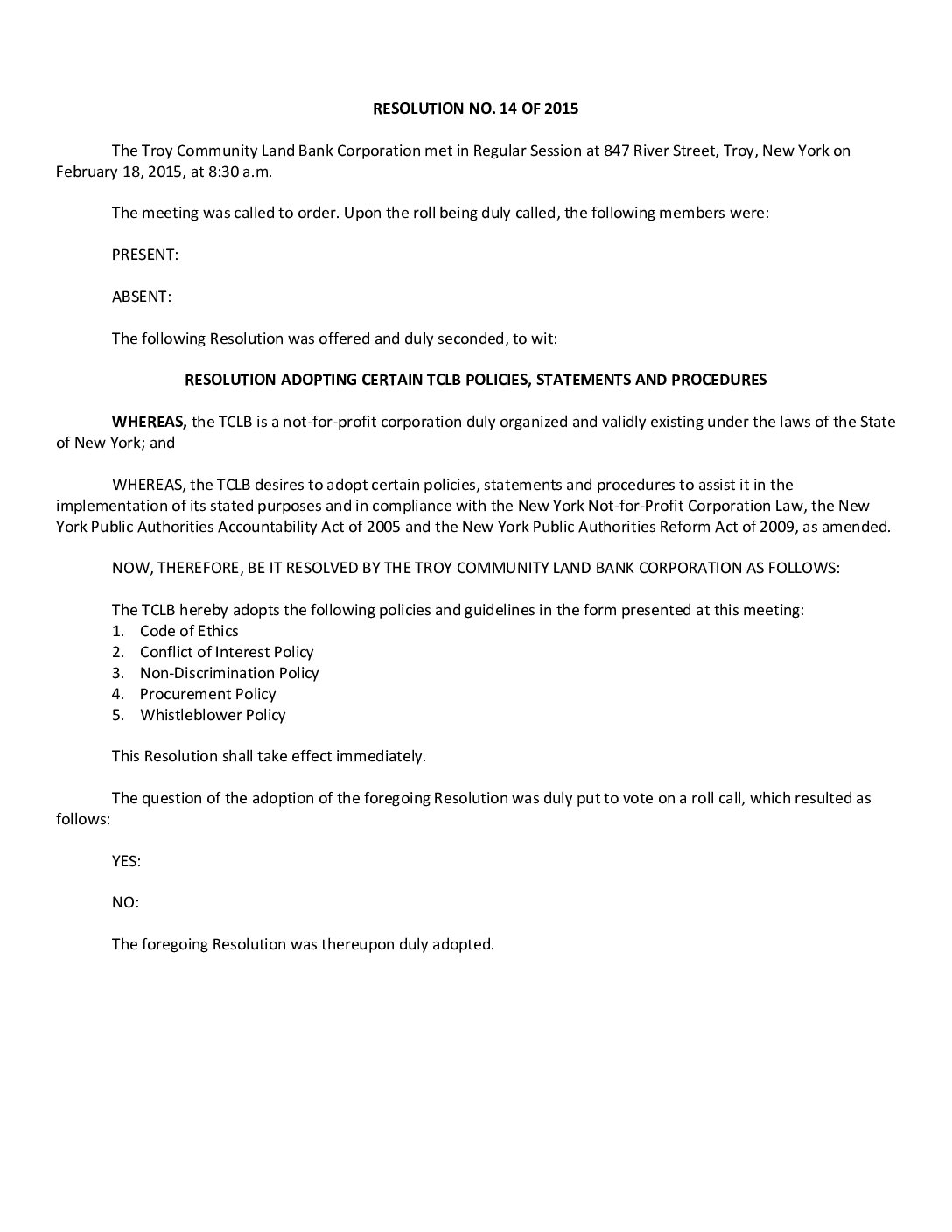 02.18.2015 Resolution 14 Adopting Certain Policies,Statements and Procedures Gallery 02.18.2015 Resolution 14 Adopting Certain Policies,Statements and Procedures 02.18.2015 Resolution 14 Adopting Certain Policies,Statements and Procedures John Ellis2025-07-09T11:18:29-04:00February 18, 2015| Read More